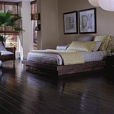 This floor's dark espresso colored stain and medium gloss surface treatment highlights the distinctive character and interlocking grain patterns. Naturally occurring crystalline compounds are found randomly throughout the species adding a signature statement and unique character.